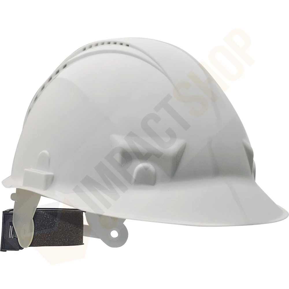 » ellenálló HDPE sisak szellőző kivitelben 6 pontos, műanyag hevederrel és automatikusan mérethez igazodó fejkosárral (53-62 cm) » hőmérséklet: -20 °C- tól 50 °C-ig » élettartam: 5 év » tömeg: 330 g » szabvány: EN 397