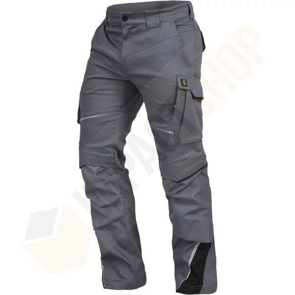 zsebek: 2 részseb, 2 hátsó zseb díszvarrással és megerősítéssel, dupla vonalzó zseb 4 tolltartó zsebbel a jobb lábszáron, cargo zseb 2 rekesszel, valamint egy cipzáras zseb és egy tolltartó zseb a bal lábszáron, térdzseb 600D/PU Oxford anyagból készült, külön térdpárna számára kialakított patenttal,