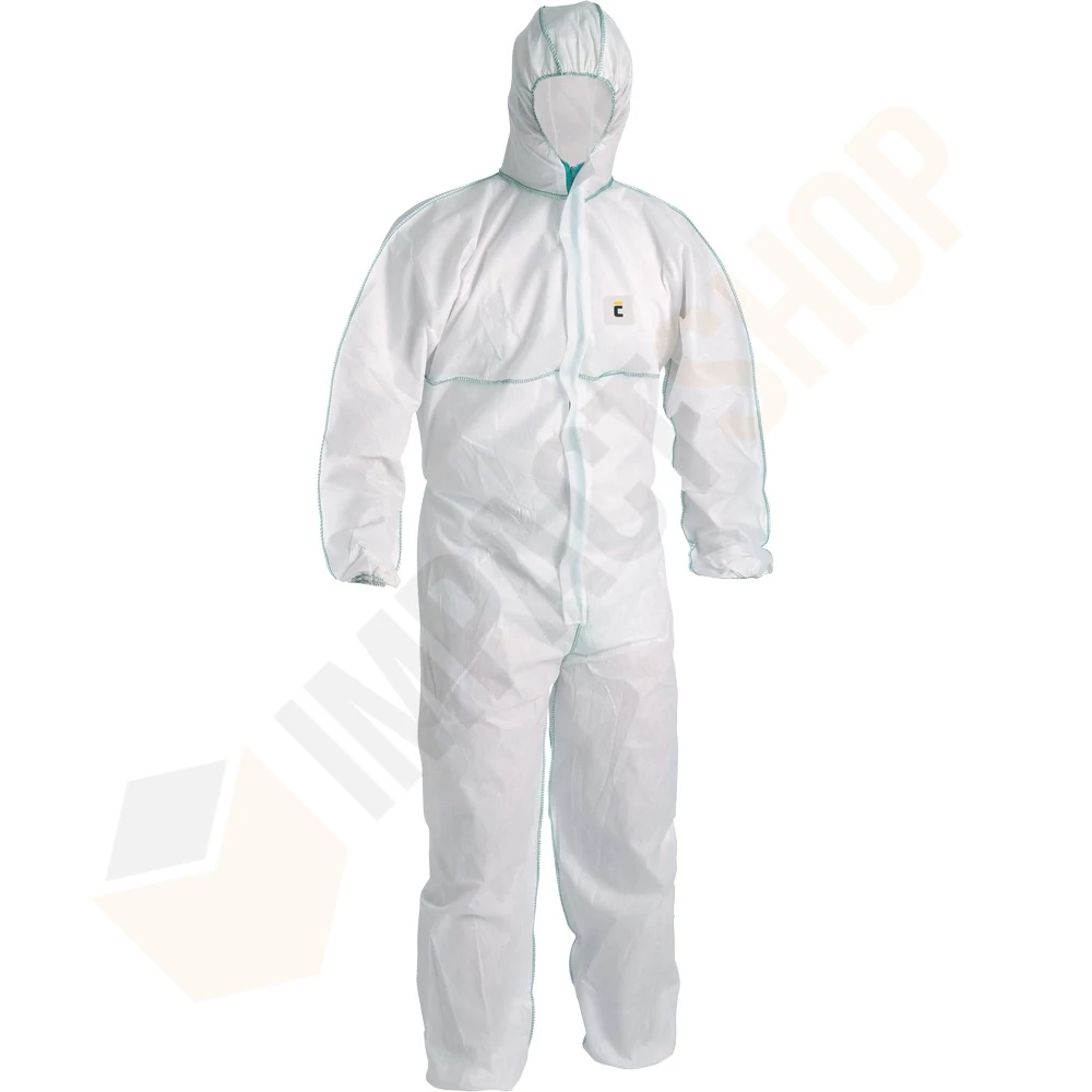 csuklyás védőoverall hajtókával fedett cipzárral, gumival összehúzható ujjal és nadrágszárral